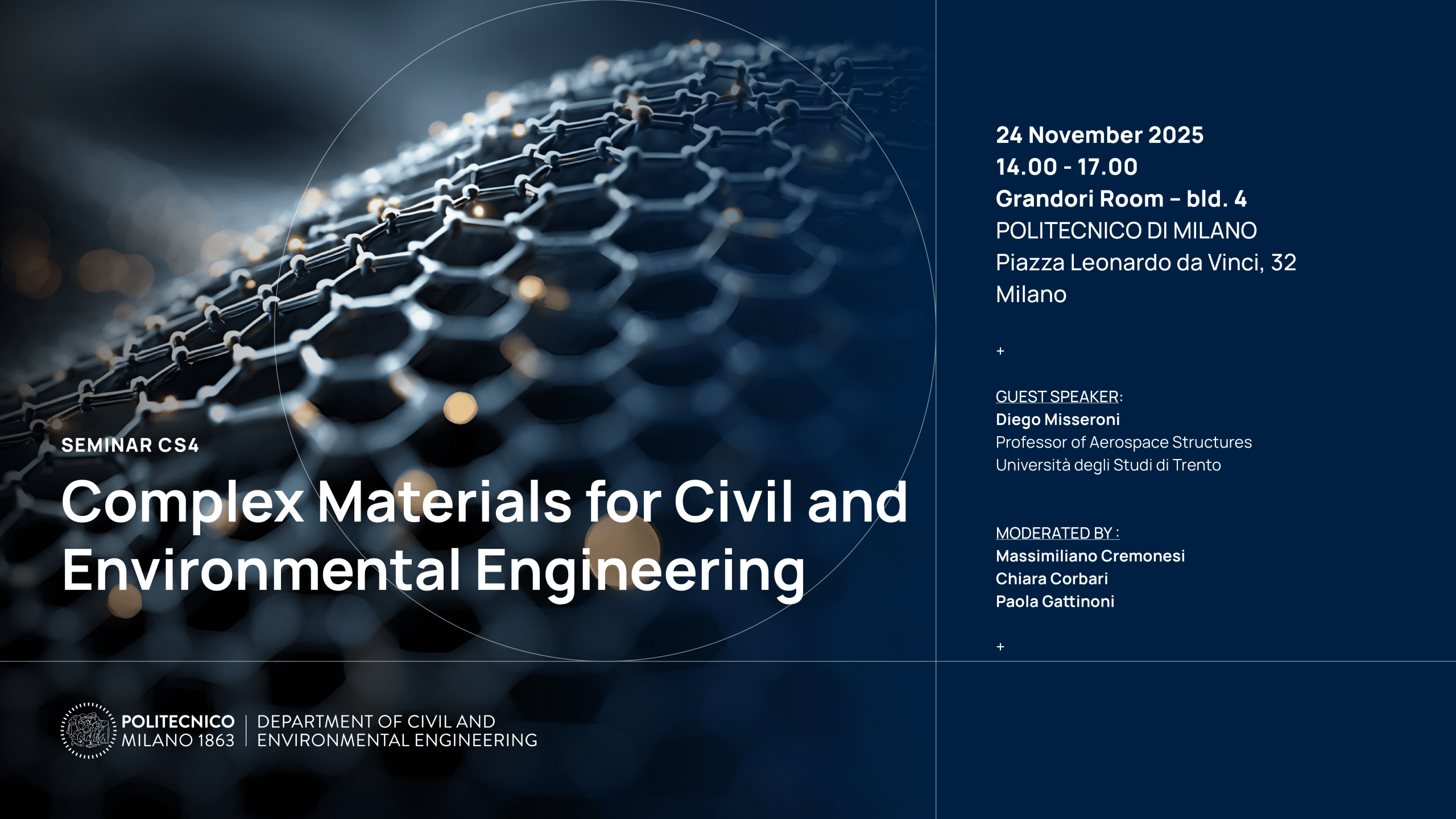 Data 24 Novembre 2025Orario 14:00 - 17:00Categoria Commissione scientificaSeminari e conferenzeEtichetta 2025civil and environmental engineeringComplex materialsDICADiego MisseroniPoliMiSeminar CS4