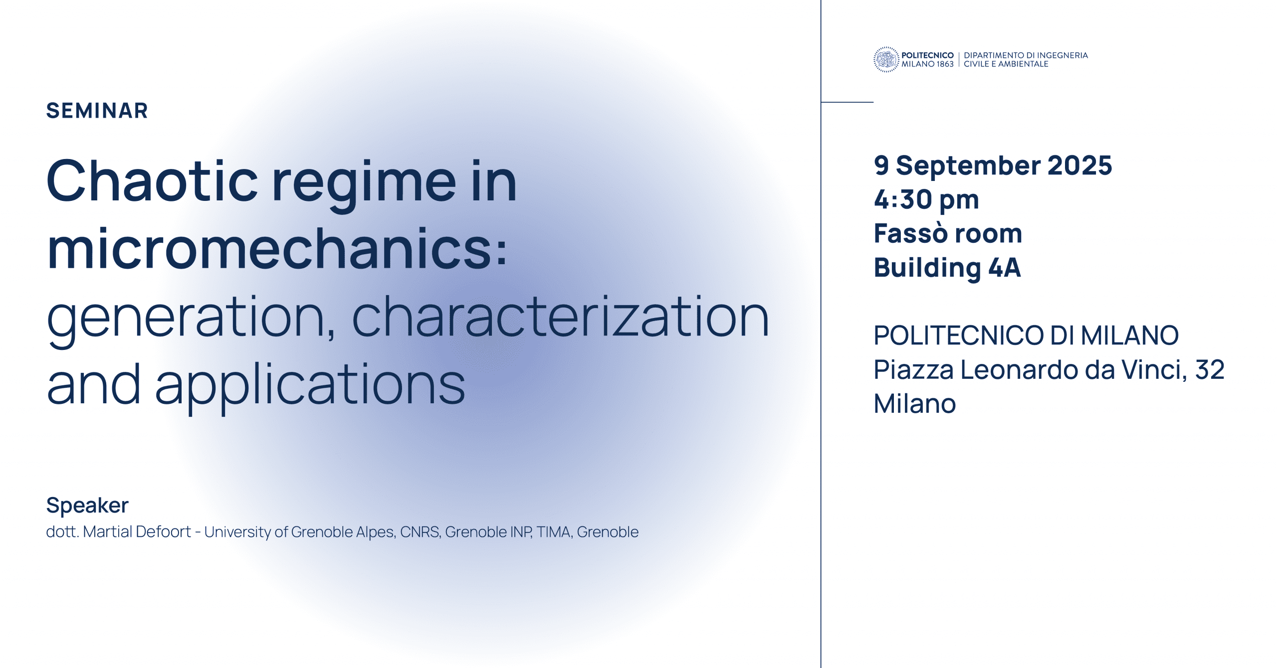 Martedì 9 settembre si terrà un seminario presso l’aula Fassò (Edificio 4A) dalle ore 16:30 dal titolo “Chaotic regime in micromechanics: generation, characterization and applications”.