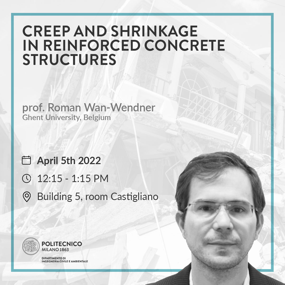 Martedì 5 Aprile si svolgerà presso l’aula Castigliano (edificio 5), un seminario dal titolo “Creep and Shrinkage in reinforced concrete structures” tenuto da Roman Wan-Wendner, Professore all’interno del Dipartimento di Ingegneria Strutturale dell’Univeristà di Ghent.