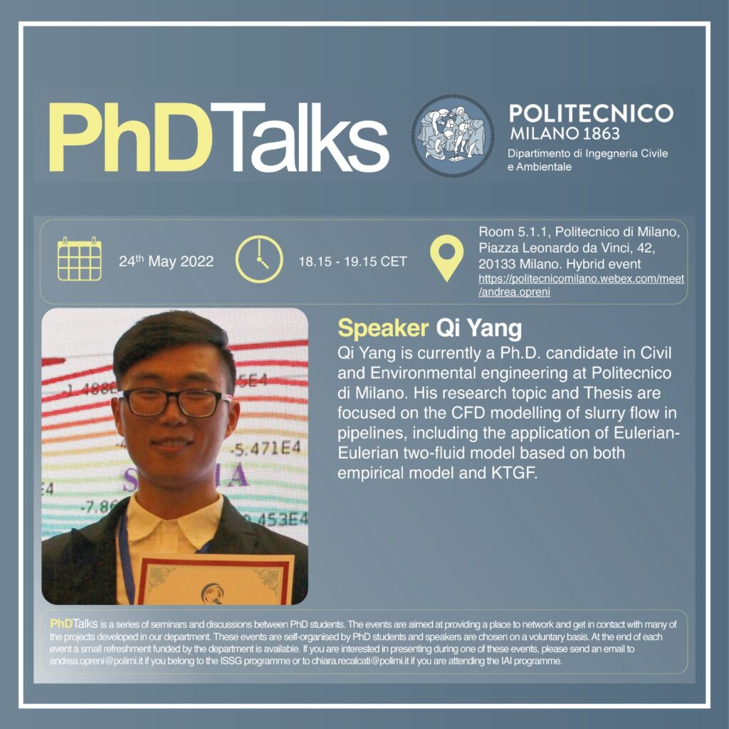 Lo speaker Qi Yang condurrà un seminario dal titolo “Development of a σ-only twofluid model for the prediction of pseudo-homogeneous slurry pipe flow”.